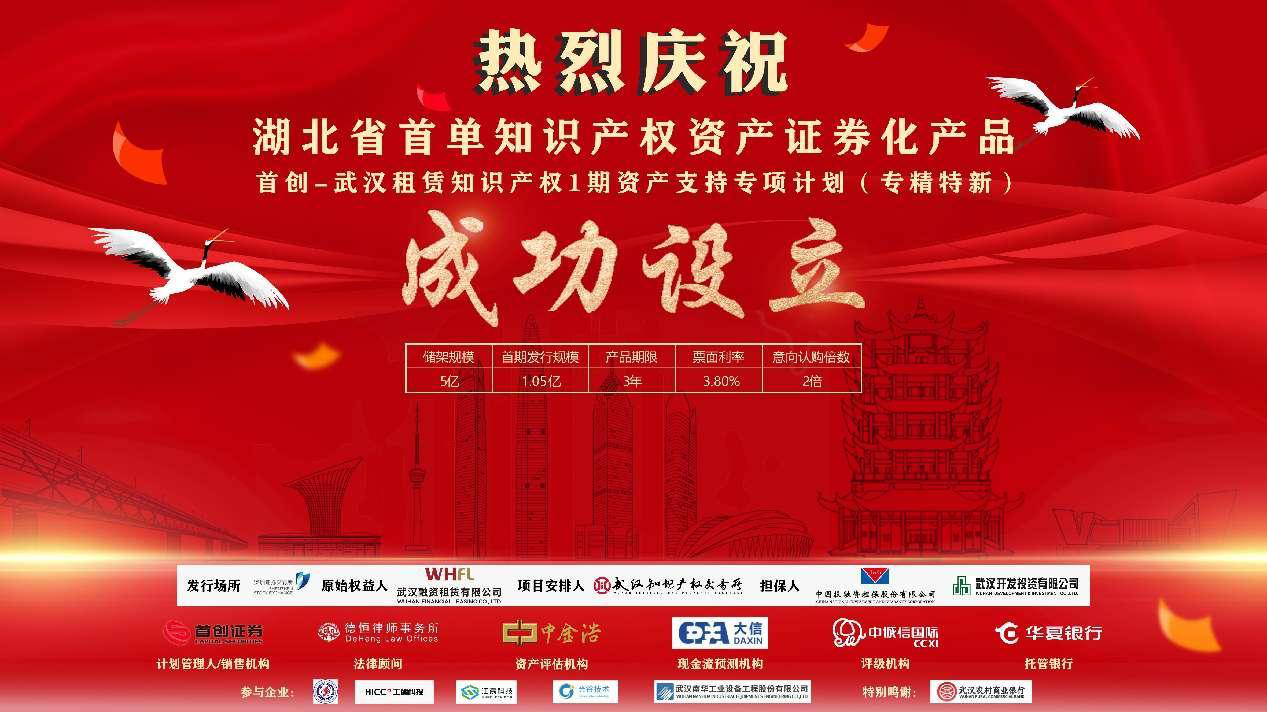 2023年12月1日,武汉知识产权交易所作为项目安排人发起的湖北省首单知识产权证券化产品—“首创-武汉租赁知识产权1期资产支持专项计划(专精特新)”在深圳证券交易所成功发行。此次产品发行规模1.05亿元,信用评级AAA,发行票面利率3.8%/年,产品期限为3年,入池基础资产均来源于专精特新企业,涉及48件授权专利,覆盖环保、电子信息、智能制造等多个技术领域。本次知识产权证券化产品成功发行,标志着知交所知识产权金融创新又迈出了坚实一步。