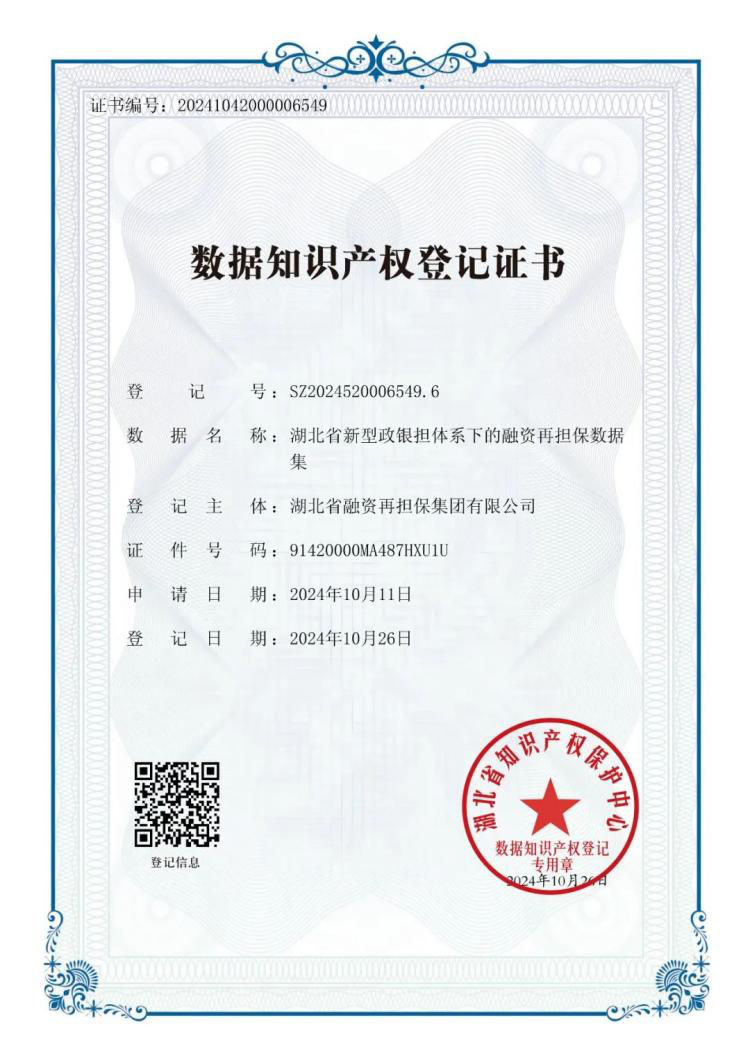 日前,省再担保集团开发的“湖北省新型政银担体系下的融资再担保数据集”(以下简称“湖北再担保数据集”)通过武汉知识产权交易所专业服务,成功取得由湖北省知识产权保护中心颁发的《数据知识产权登记证书》,并在全国率先实现省级再担保平台数据资产入表。