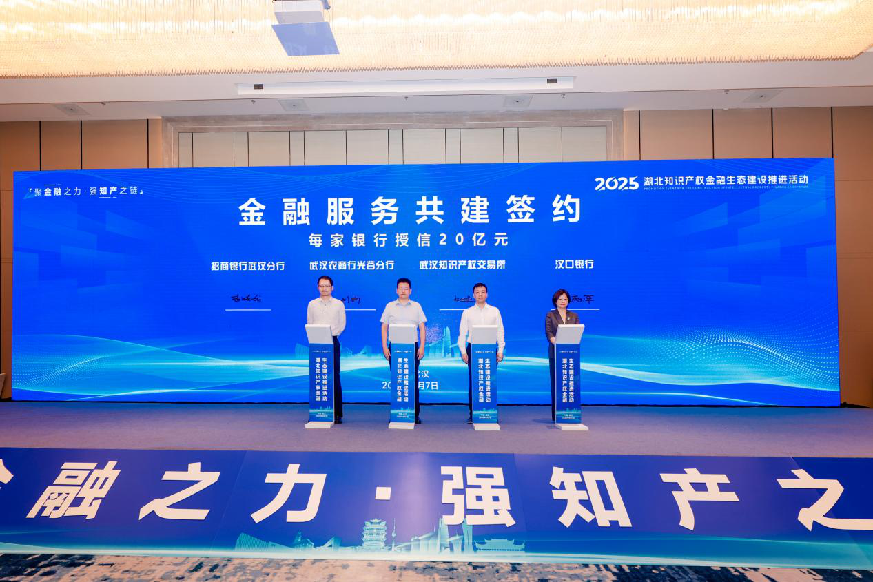 2025年8月7日,以“聚金融之力・强知产之链”为主题的2025年湖北知识产权金融生态建设推进活动在武汉市江夏区隆重举行。武汉知识产权交易所在活动中与三家银行达成重要合作签约,参与承建的湖北省中小企业融资信用平台(鄂融通)知识产权金融服务专区的正式上线,成为湖北知识产权金融生态建设的重要力量。